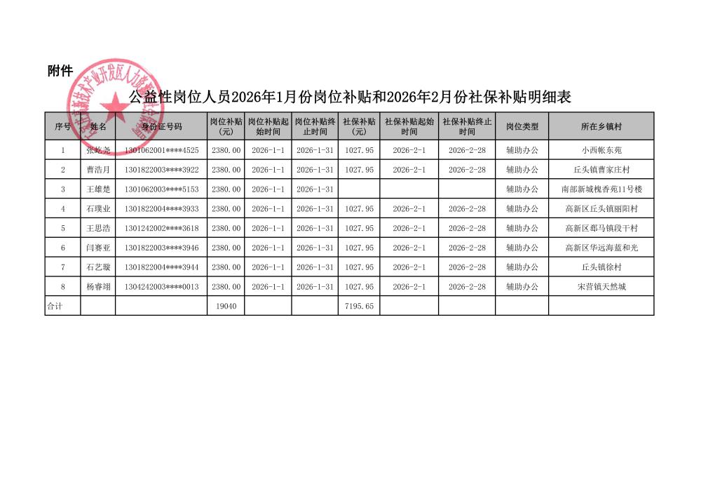 公益性岗位人员2026年1月份岗位补贴和2026年2月份社保补贴明细表