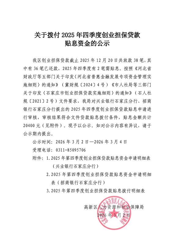 关于拨付2025年四季度创业担保贷款贴息资金的公示