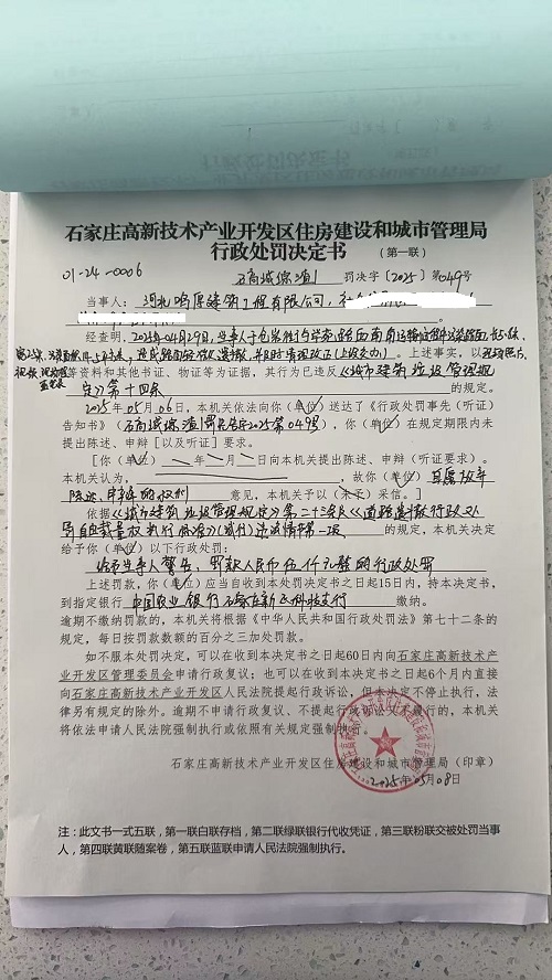 高新区住房建设和城市管理局行政处罚决定书 石高城综渣1罚决字〔2025〕第049号
