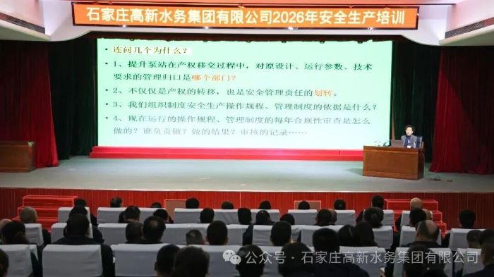 为深入贯彻落实高新水务集团安全工作部署,进一步强化各级管理人员安全生产责任意识,2月4日,集团在职工之家开展安全生产专题培训。集团各级公司中层以上管理人员、相关业务科室负责人、班组长及专兼职安全管理人员共计95人参训。