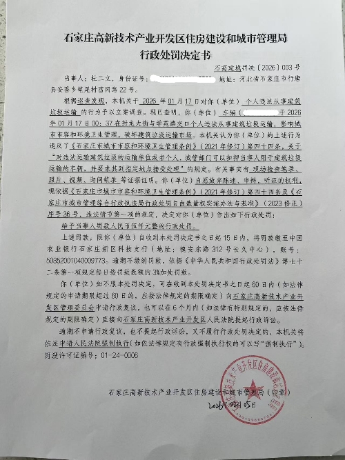 高新区住房建设和城市管理局行政处罚决定书 石高建城罚决〔2026〕003号