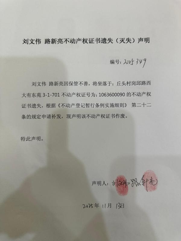 刘文伟、路新亮不动产权证书遗失(灭失)声明(编号:2025349)