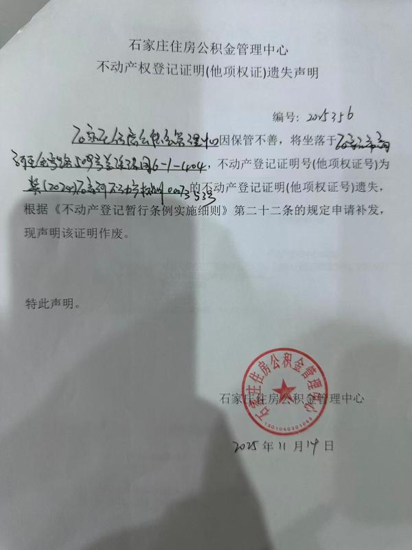 石家庄住房公积金管理中心不动产权登记证明(他项权证)遗失声明(编号:2025356)