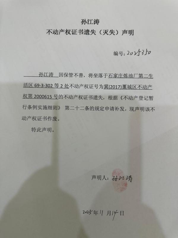 孙江涛不动产权证书遗失(灭失)声明(编号:2025350)