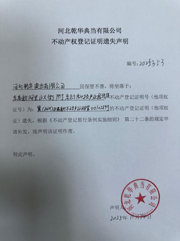 河北乾华典当有限公司不动产权登记证明遗失声明(编号:2025353)