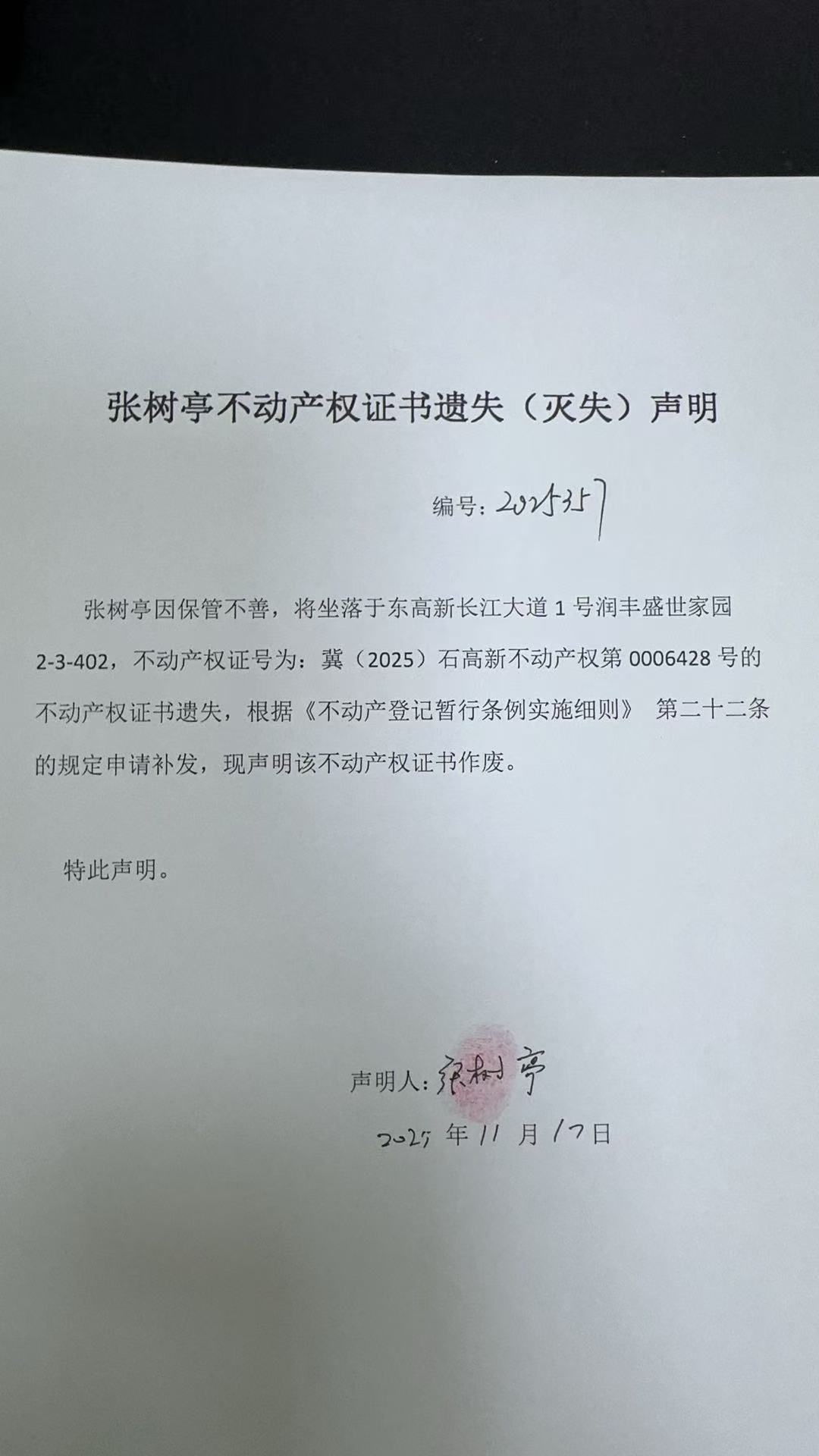 张树亭不动产权证书遗失(灭失)声明(编号:2025357)