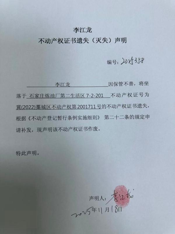 李江龙不动产权证书遗失(灭失)声明(编号:2025358)