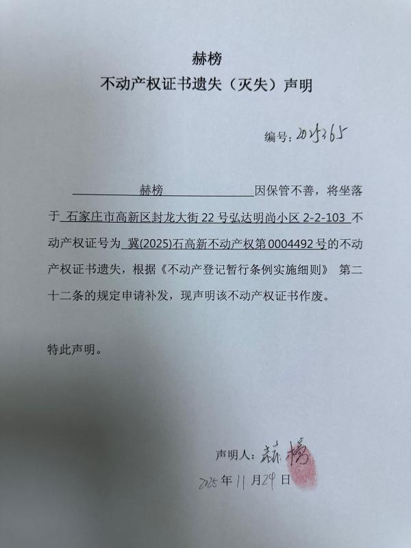 赫榜不动产权证书遗失(灭失)声明(编号:2025365)