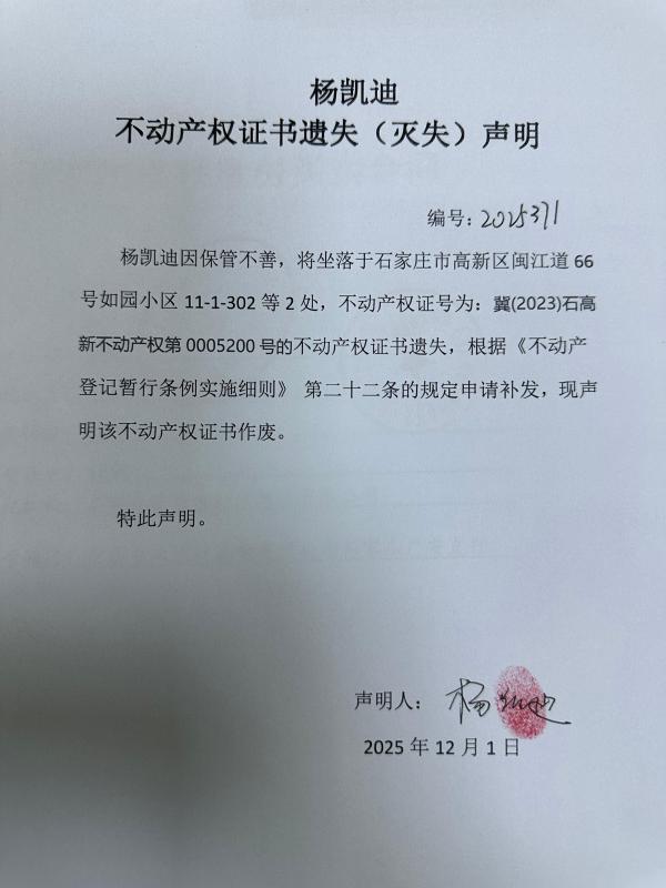 杨凯迪不动产权证书遗失(灭失)声明(编号:2025371)