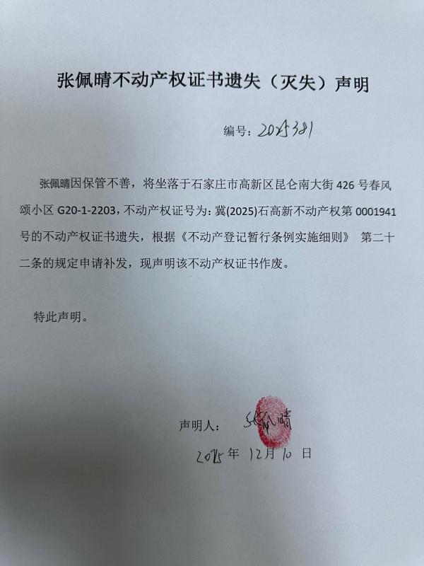 张佩晴不动产权证书遗失(灭失)声明(编号:2025381)
