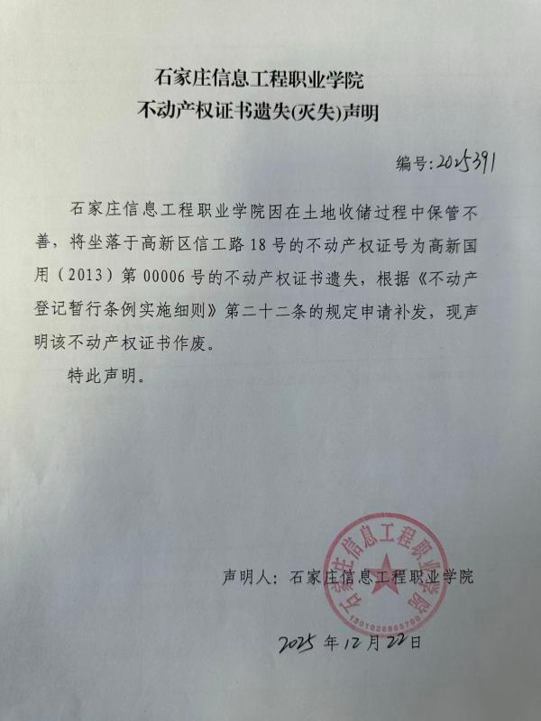 石家庄信息工程职业学院不动产权证书遗失(灭失)声明(编号:2025391)