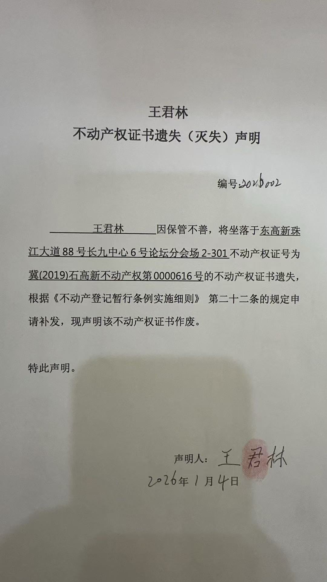 王君林不动产权证书遗失(灭失)声明(编号:2026002)
