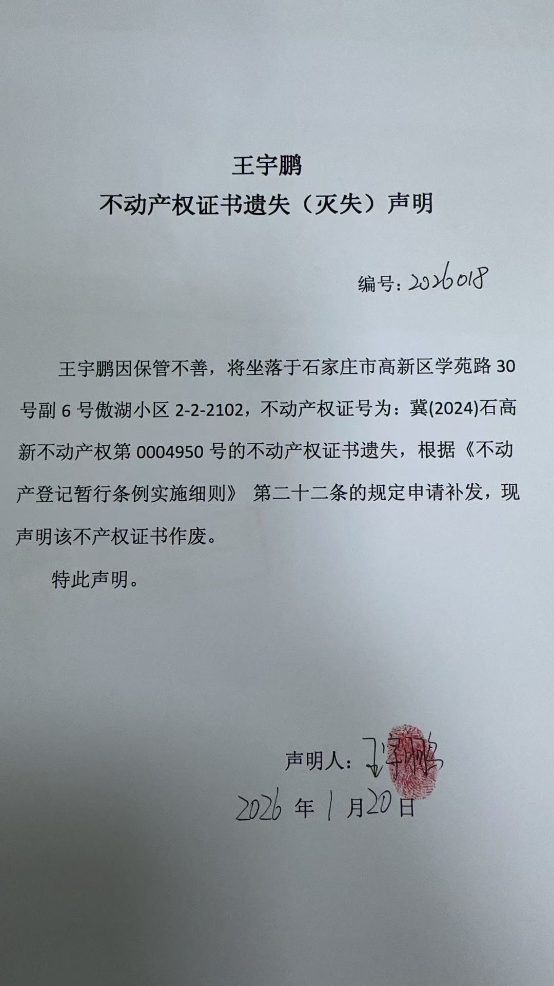 王宇鹏不动产权证书遗失(灭失)声明(编号:2026018)