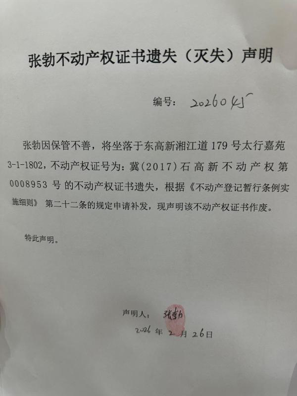 张勃不动产权证书遗失(灭失)声明(编号:2026045)