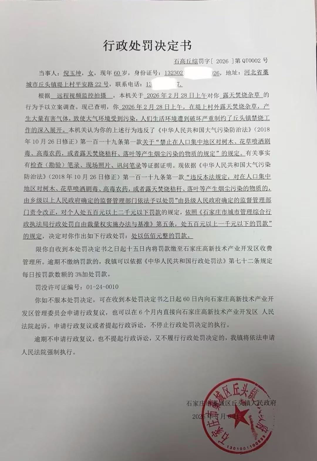石高丘综罚字【2026】第QT0002号