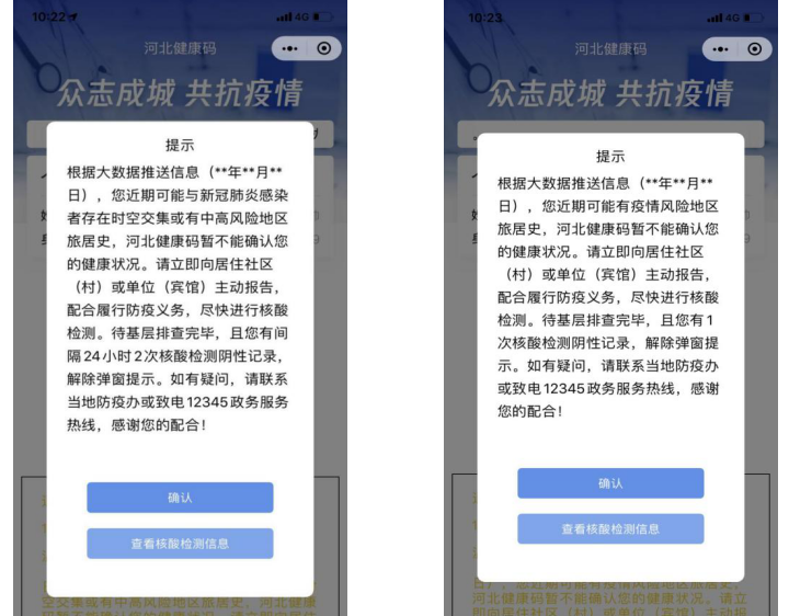 弹窗提示的内容为:根据大数据推送信息(*年*月*日),您近期可能与新冠肺炎感染者存在时空交集或有中高风险地区旅居史,河北健康码暂不能确认您的健康状况。请立即向居住社区(村)或单位(宾馆)主动报告,配合履行防疫义务,尽快进行核酸检测。待基层排查完毕,且您有规定的检测阴性记录,解除弹窗提示。如有疑问,请联系当地防疫办或致电12345政务服务热线,感谢您的配合!