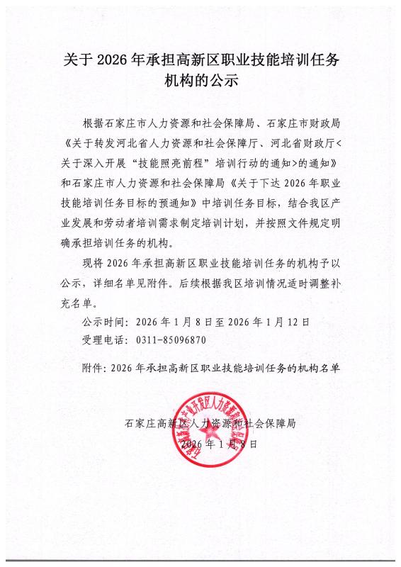 关于2026年承担高新区职业技能培训任务机构的公示