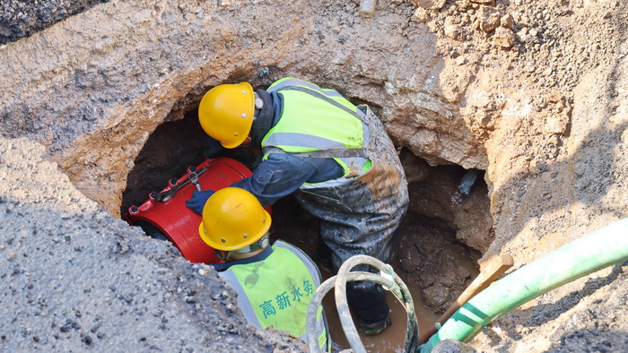 8时许,抢修人员已高效完成周边围挡的搭建及警示标志的设置,随即开展路面破拆作业。随着挖掘机的谨慎作业,一个2米见方的工作面被挖出来,露出了DN300球墨铸铁管——管道上有一道长约10厘米的圆形破口,正是施工方进行地下引管时被钻头打穿的,清水正汩汩地从破口中涌出来。“准备安装哈夫节!”抢修班长一声令下,两名施工人员迅速穿上蛤蟆衣,跳入冰冷的泥水中,用铁锹手动挖开破口周围的泥土,清洁管体表面,快速打磨对接口,将哈夫节稳稳安装在漏点位置,麻利地进行对角螺栓紧固,确保受力均匀、牢固可靠。随着最后一颗螺栓紧固到位,破损点水流逐渐减弱,最终停止漏水。此时,时针指向11时30分。从抵达现场到成功止漏,整个过程仅耗时3个小时。随后,抢修人员快速完成了工作坑的回填及管道冲洗,随着阀门缓缓开启,周边居民区及企业供水全面恢复正常。