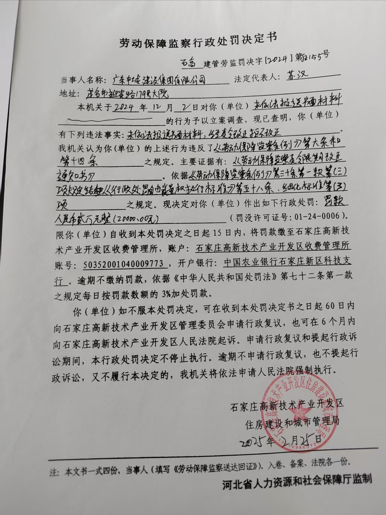 2024年12月2日,高新区劳动监察大队对广东中城建设集团有限公司未依法报送书面材料的违法行为进行了立案调查。经劳动保障监察部门责令限期改正拒不改正,违反了《国务院劳动保障监察条例》第六条和第十四条之规定,依据《国务院劳动保障监察条例》第三十条第一款第(三)项之规定,结合《行政处罚自由裁量权执行标准》第五十八条,细化标准第(3)项规定,给予该单位人民币贰万元的行政处罚。