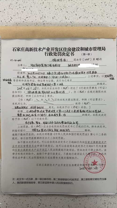 高新区住房建设和城市管理局行政处罚决定书 石高城综渣1罚决字〔2025〕第043号
