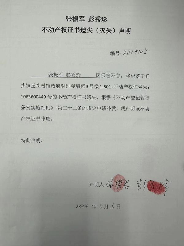 张振军 彭秀珍不动产权证书遗失(灭失)声明(编号:2024105号)