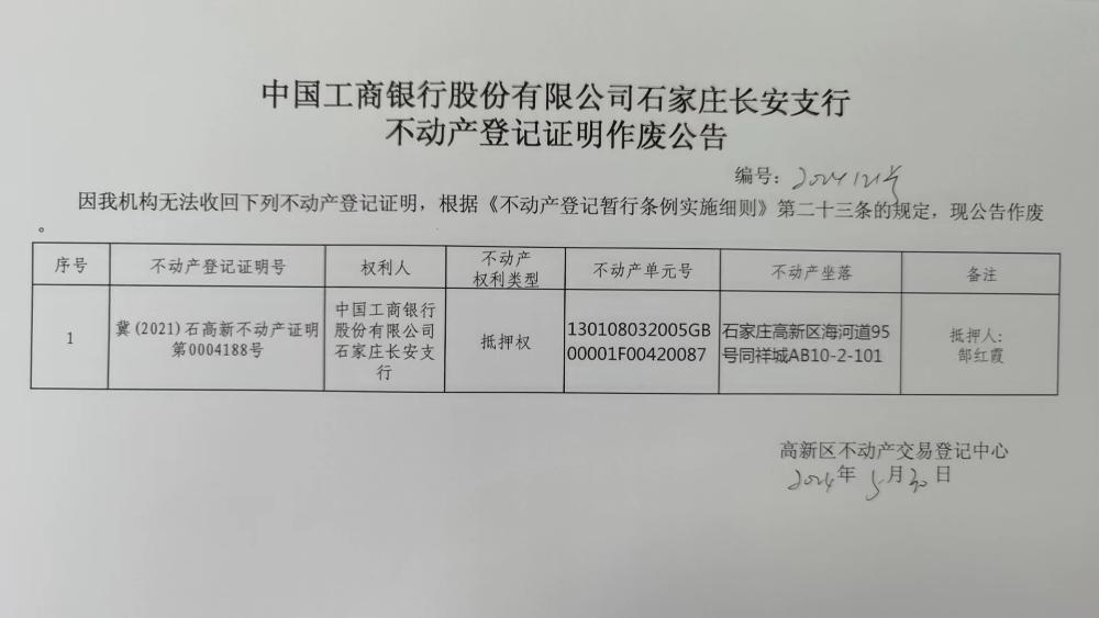 中国工商银行股份有限公司石家庄长安支行不动产登记证明作废公告(编号:2024121号)