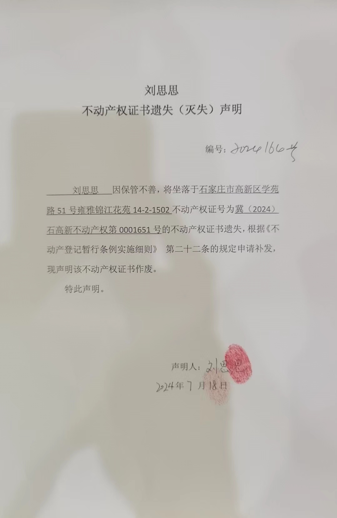 刘思思不动产权证书遗失(灭失)声明(编号:2024164号)
