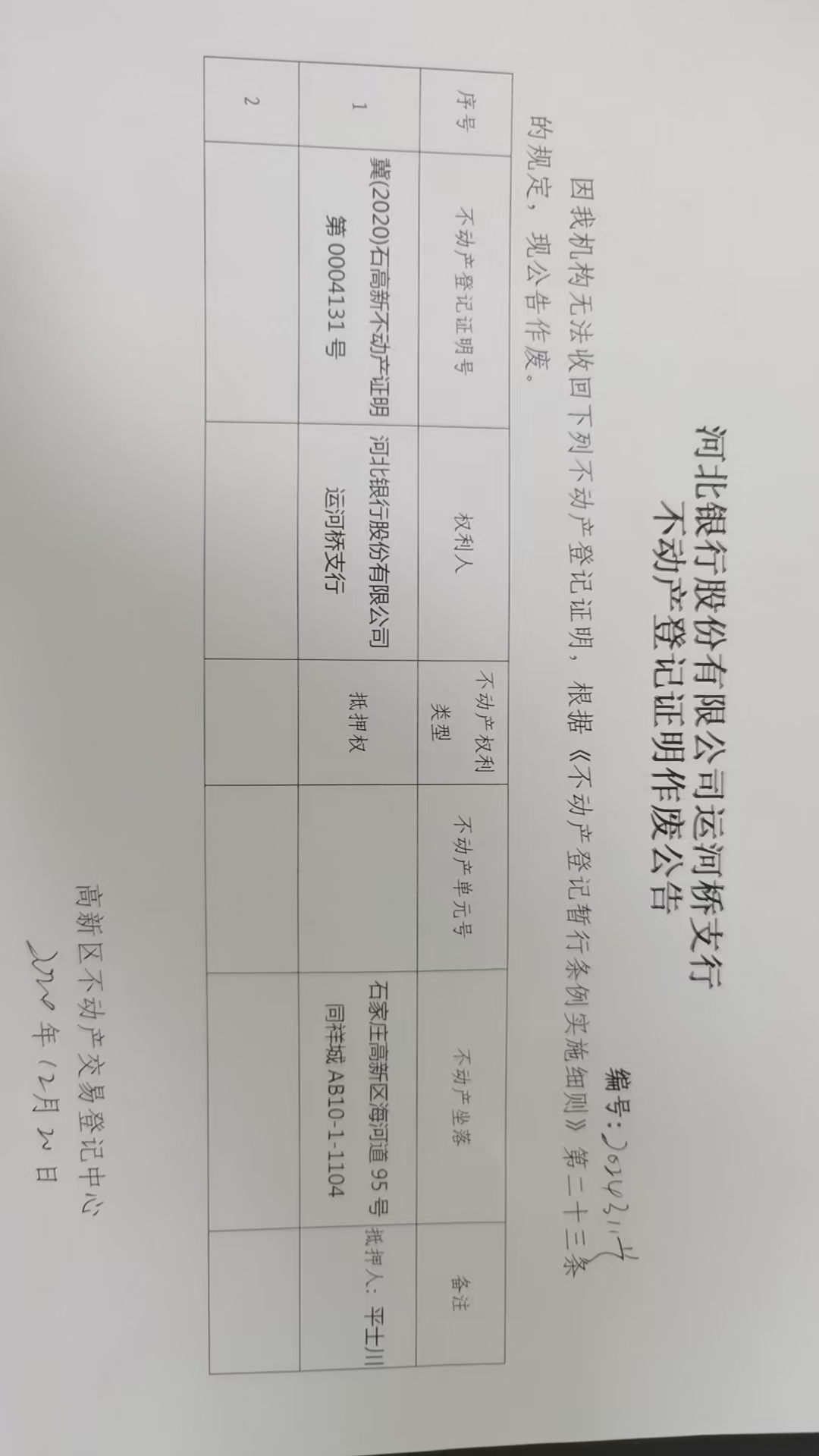 河北银行股份有限公司运河桥支行不动产登记证明作废公告(编号:2024311号)