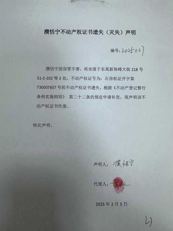 濮恬宁不动产权证书遗失(灭失)声明(编号:2025027号)