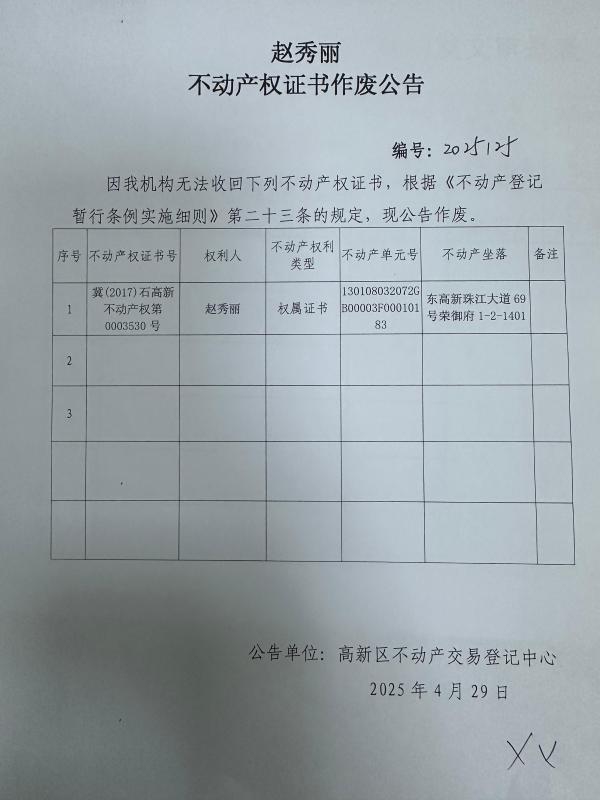 赵秀丽不动产权证书作废公告(编号:2025125号)