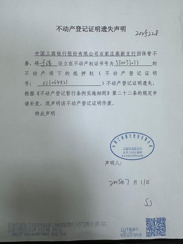 中国工行银行股份有限公司石家庄高新支行不动产登记证明遗失声明(编号:2025228)