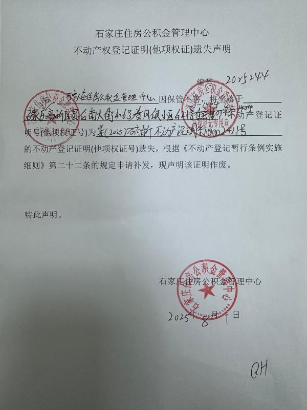 石家庄住房公积金管理中心不动产登记证明(他项权证)遗失声明(编号:2025244)
