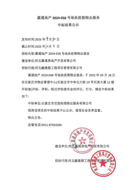 冀通地产2024-038号地块前期物业服务中标结果公示