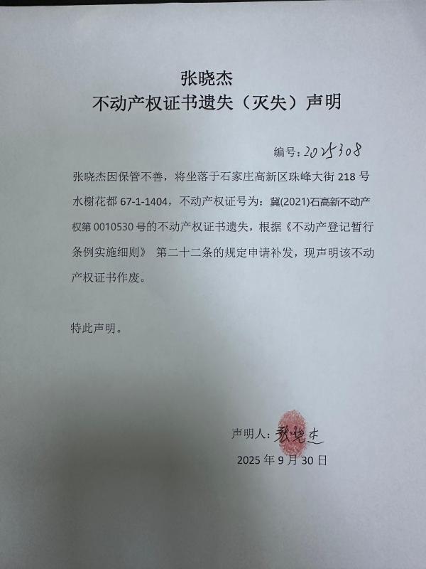 张晓杰不动产权证书遗失(灭失)声明(编号:2025308)