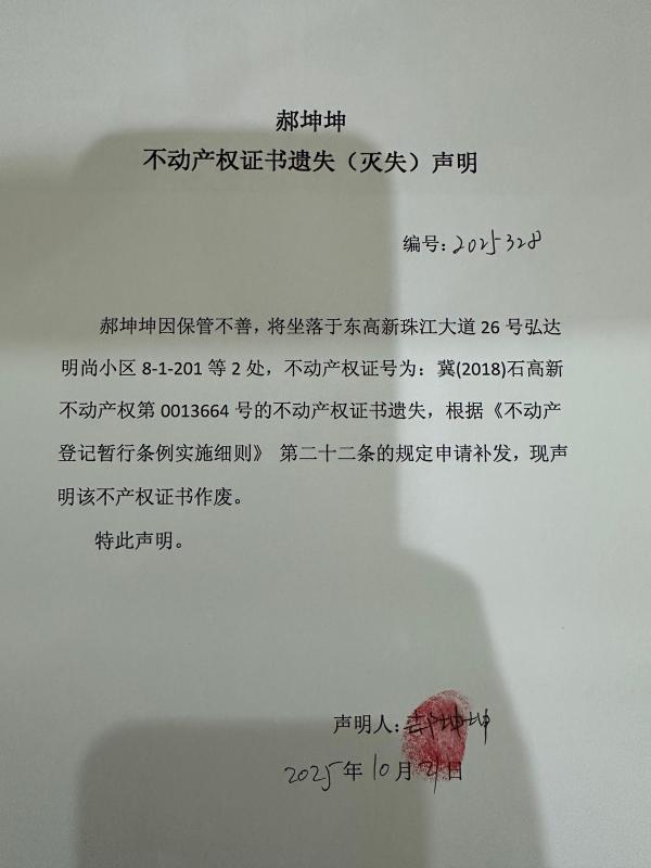 郝坤坤不动产权证书遗失(灭失)声明(编号:2025328)
