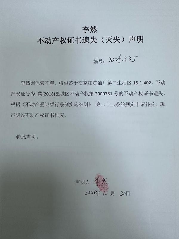 李然不动产权证书遗失(灭失)声明(编号:2025335)