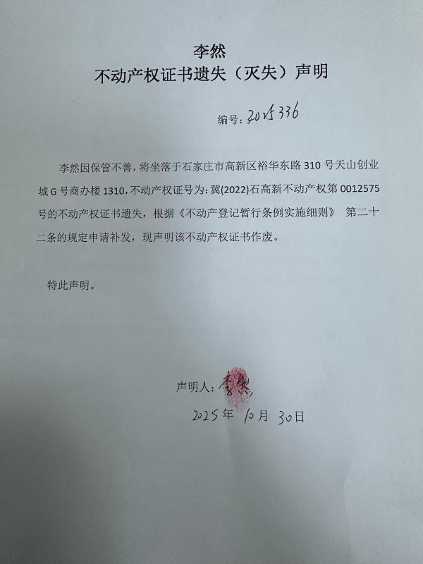 李然不动产权证书遗失(灭失)声明(编号:2025336)