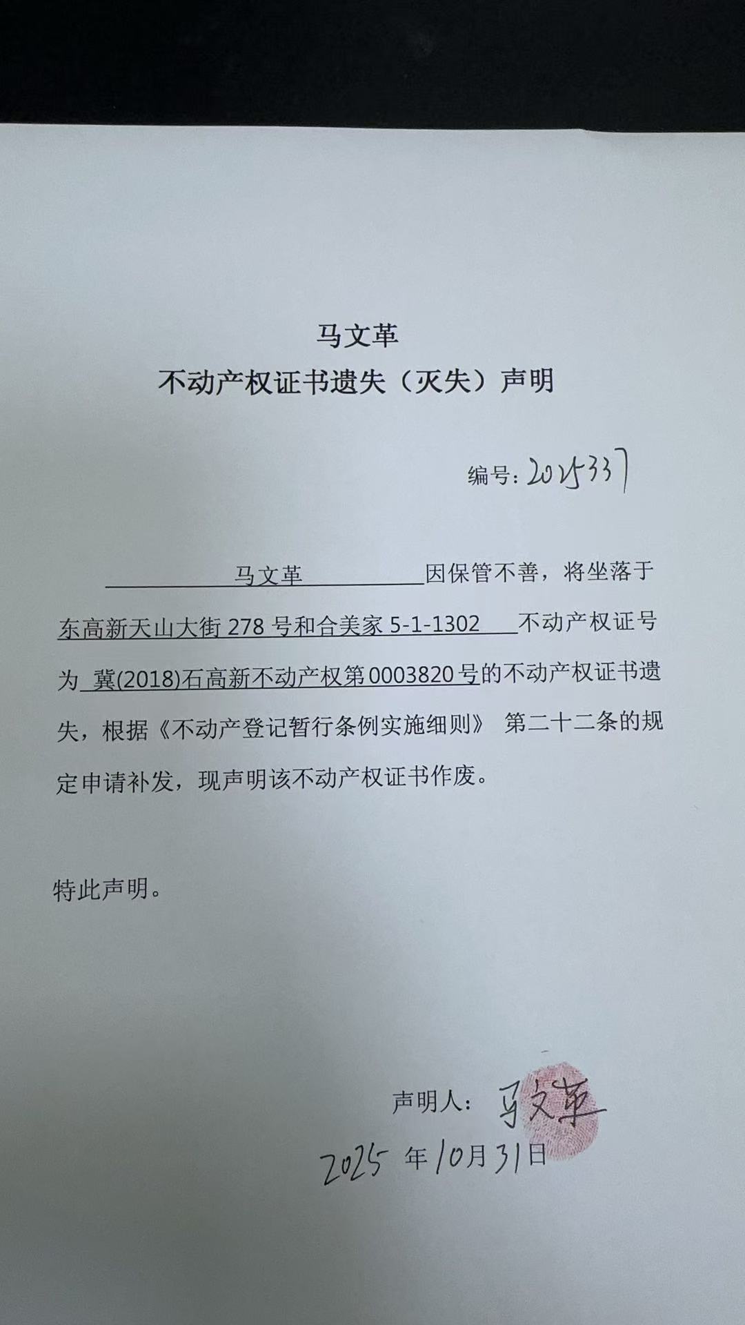 马文革不动产权证书遗失(灭失)声明(编号:2025337)
