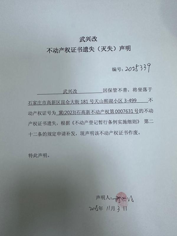 武兴改不动产权证书遗失(灭失)声明(编号:2025339)