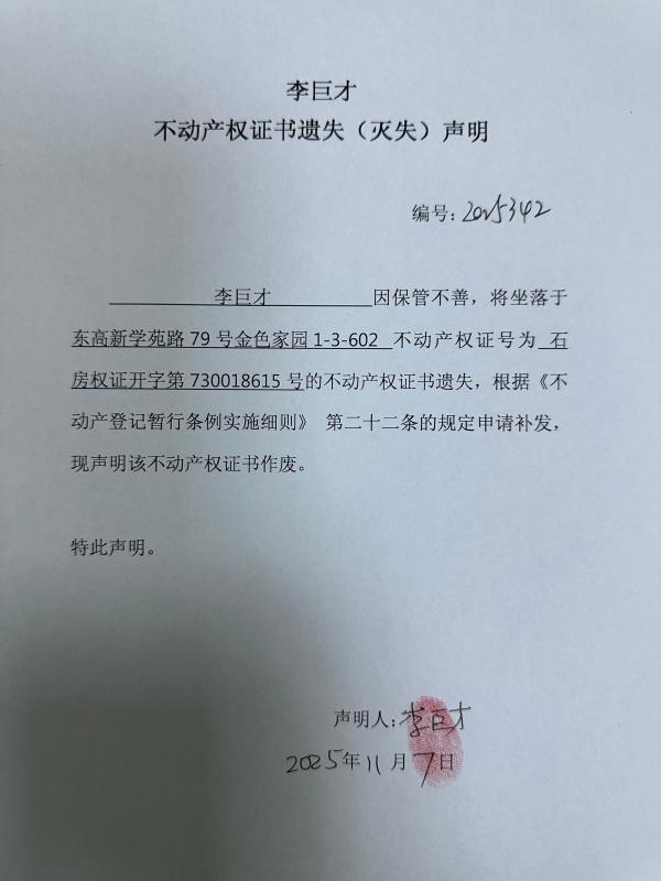 李巨才不动产权证书遗失(灭失)声明(编号:2025342)
