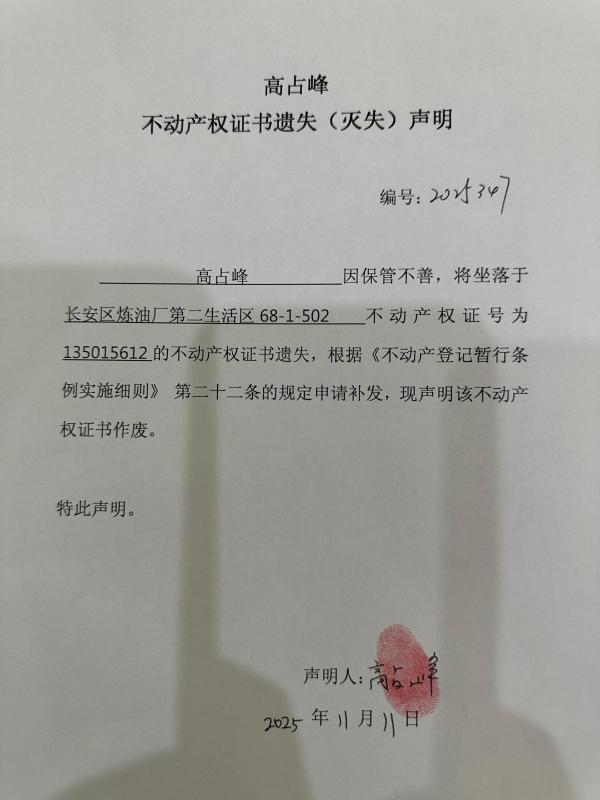 高占峰不动产权证书遗失(灭失)声明(编号:2025347)