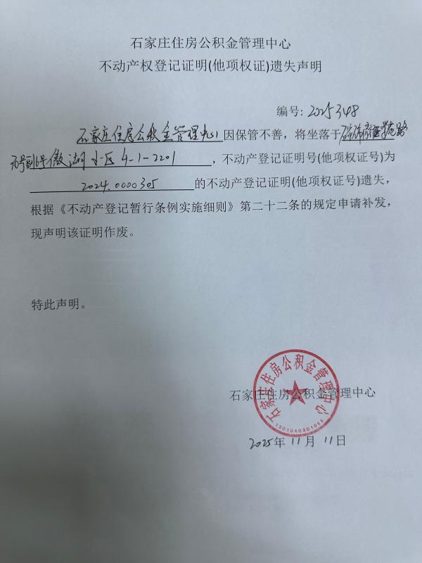 石家庄住房公积金管理中心不动产权登记证明(他项权证)遗失声明(编号:2025348)