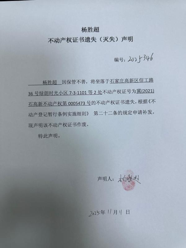 杨胜超不动产权证书遗失(灭失)声明(编号:2025346)