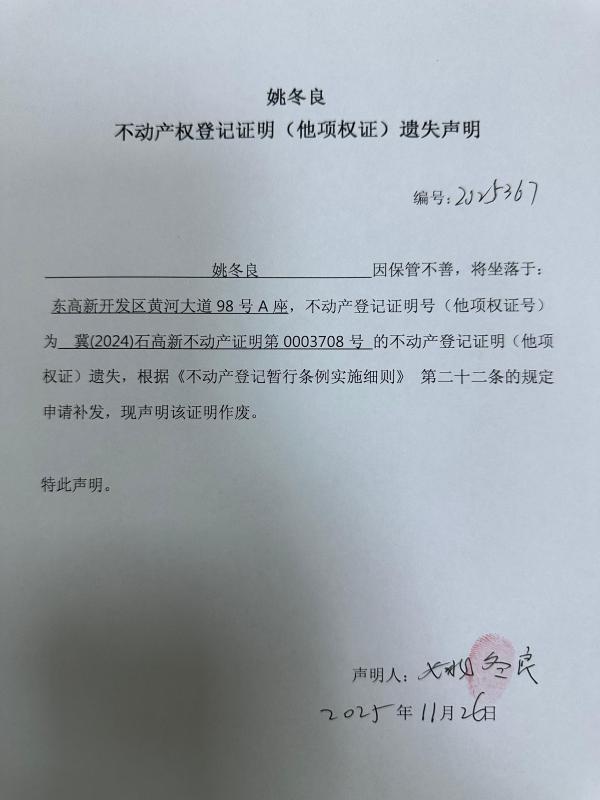 姚冬良不动产登记证明(他项权证)遗失声明(编号:2025367)