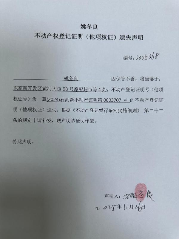 姚冬良不动产登记证明(他项权证)遗失声明(编号:2025368)
