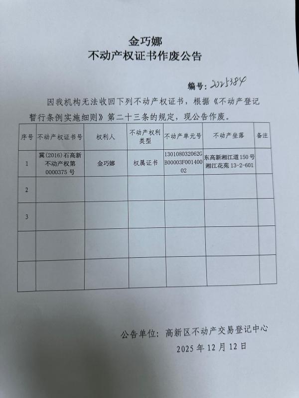 金巧娜不动产权证书作废公告(编号:2025384)