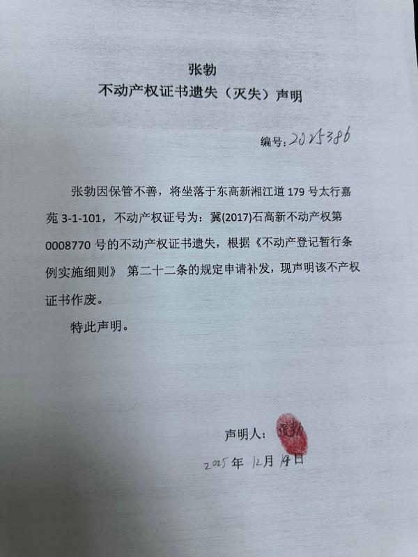 张勃不动产权证书遗失(灭失)声明(编号:2025386)