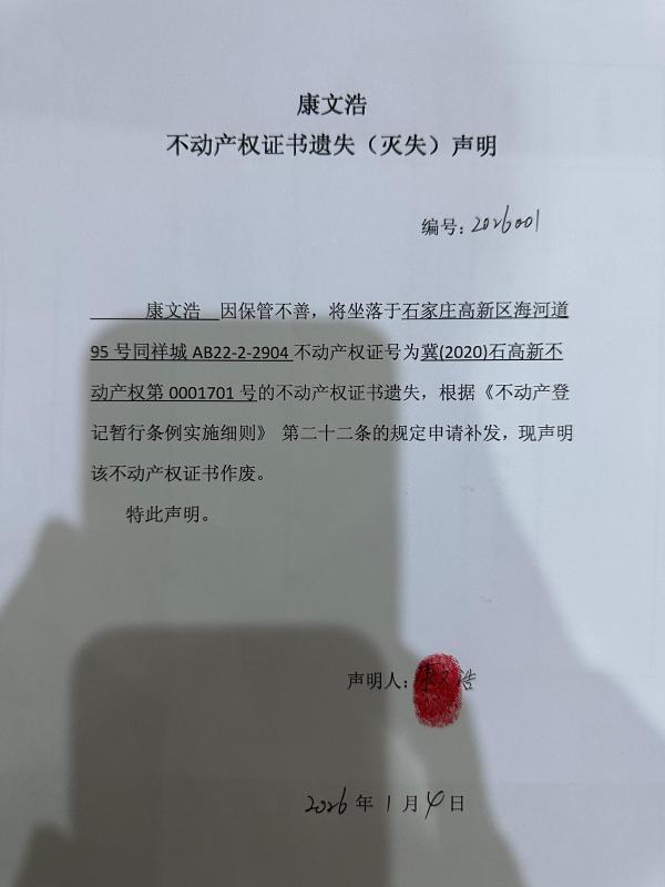 康文浩不动产权证书遗失(灭失)声明(编号:2026001)