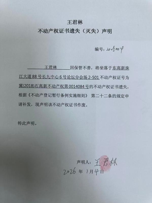 王君林不动产权证书遗失(灭失)声明(编号:2025004)
