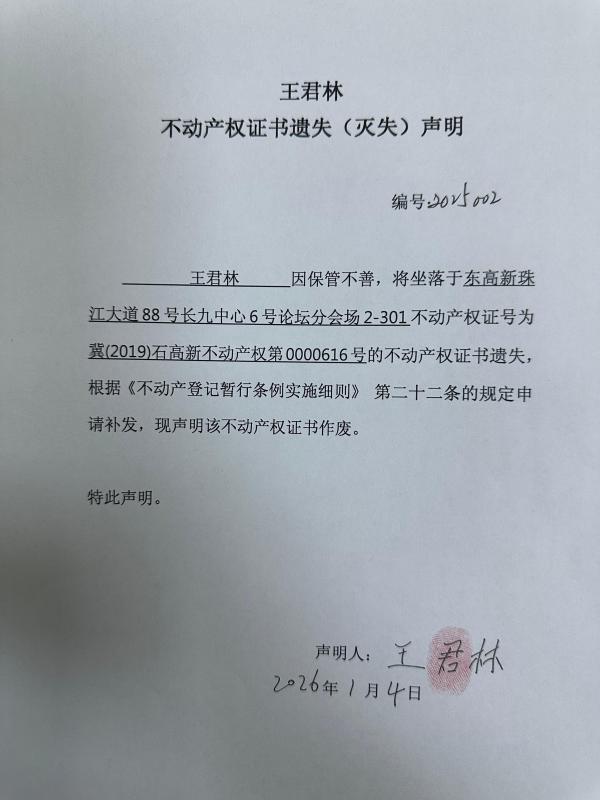 王君林不动产权证书遗失(灭失)声明(编号:2026002)